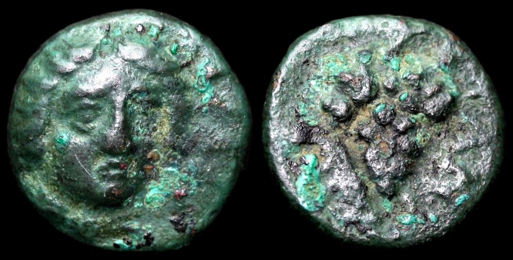 Kopf des Helios mit Strahlenkranz en face, Kopf leicht nach rechts gewandt. Rs.[K]PAN. Traube mit Ranke, (l. im Feld Garnele). SNG Keckman 219. Slg. Klein 535. A. Walker, Kranaos, A new mint in Caria, SM 112 (1978), S. 87, Fig. 4.