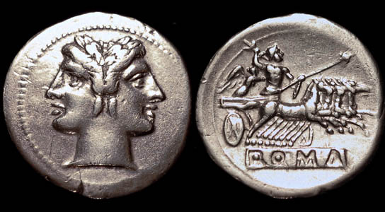 Bronzemünzen im griechischen Stil wurde bereits um das Jahr 300v. geprägt, nicht nur die Motive auf den Münzen war aus der griechischen Münzprägung entnommen, sondern auch die Nominale. Die ersten Silbermünzen hießen Drachme oder Didrachme. Die erste römische Silbermünze, von der angenommen wird, dass sie in Rom geprägt wurde, wurde um 269v. geschlagen. Einige Historiker vermuten, dass der Wert der Didrachme zehn Asse betrug, ebenso wie der Denar, der gut fünfzig Jahre später eingeführt werden sollte.