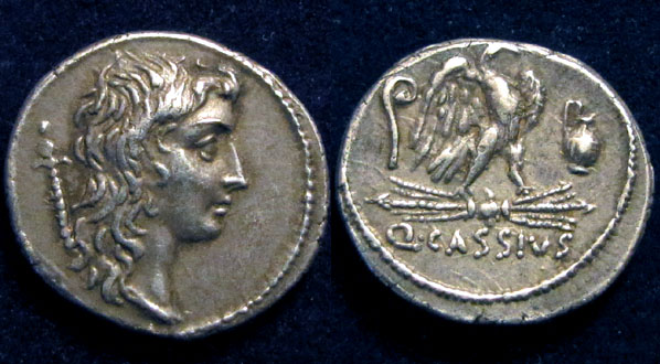 Münzmeister Q. Cassius Longinus Av. Bonus Eventus (oder Genio Populi Romani?) rechts, dahinter Zepter Rv. Adler mit geöffneten Schwingen zwischen Lituus und Opferkanne auf Fulmen rechts, im Abschnitt Q CASSIVS 19mm 3,48g Cr. 428/3 Sear 391 Albert 1355 (Neudatierung: 53v.??)
