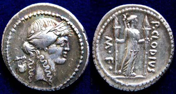 Av. belorbeerter Kopf des Apollon recht, dahinter Kithara Rv. Diana zwischen Stabfackeln, links M.F., rechts P.CLODIVS 20,1mm 4,01g Crawford 494/23 Sydenham 1117 BMCRR Rome 4290 Ex: Münzen&Medaillen Deutschland Weil am Rhein
