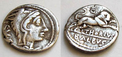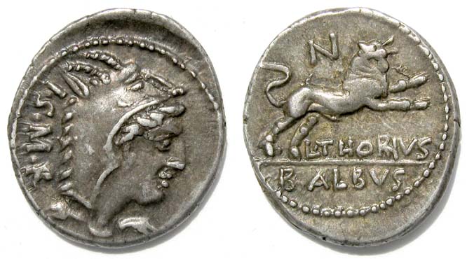Lucius Thorius Balbus aus Lanuvium (Cic. fin. 2,63ff. vgl. 70) in der italienischen Region Latium, ein "Epikureer", d. h. Anhänger einer philosophischen Schule, die später von den Christen als "Genussmenschen" bezeichnet wurden, war ca. 100 bis 95 v. Chr. Münzmeister (vgl. Der Kleine Pauly Band V, S. 775) in Rom. Ob er den Stier als Münzzeichen in Anspielung auf seinen Namen führte, gilt als nicht ganz gesichert. Zur modernen Datierung vgl. Brougthon 2,453. Im Jahre 79 v. Chr. war er unter dem Prokonsul Metellus Pius Legat in Spanien und fiel dort während der ersten Kämpfe gegen die Truppen des rebellischen Quintus Sertorius unter dem Kommando des Quästor Lucius Hirtuleius (Flor. 2,10,6f.; A. Schulten Fontes Hisp. Antiqu. 4, 1937, S. 354)