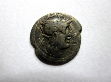 Das dürfte diese anonyme Prägung von 128 BC mit dem Elefantenkopf unter der Biga sein.