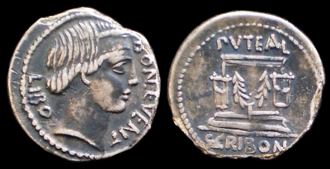 Das hier gezeigte Puteal (eigentlich "Brunnen", in diesem Fall Einfassungen von Blitzmalen) befand sich auf dem Forum in Rom um die Stelle als heilige Erde zu kennzeichnen in die ein Blitz eingeschlagen hatte. Es wurde von Scribonius Libo erneuert und wurde daher auf die Münzen der Scribonier häufig geprägt.