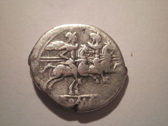 Es handelt sich um eine anonyme Silberprägung der römischen Republik. Kopf der Roma, dahinter X. Dioskuren reiten nach rechts, ROMA in ex. Was die Referenz angeht, so dürfte es sich um irgendeine Variante von RSC 20ff. handeln. Datierung: ca. +/- 200 v. Chr. Leider ist keines der üblichen Beizeichen erkennbar, sodaß eine genauere Bestimmung zumindest mir nicht möglich erscheint.