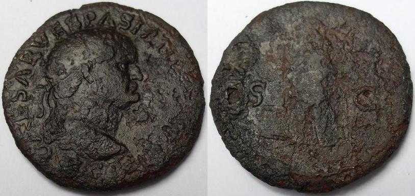 Diese AE29-Bronze bringt 10,90 g auf die Waage. Die Vs zeigt die berlorbeerte Büste des Vespasian mit der Legende CAESAR VESPASIAN.... Auf der Rs eine stehende Person, S-C weit auseinander geschrieben und drum herum ein Perlkreis - keine weitere Legende! Wer könnte dargestellt sein? Könnt ihr mir auch Zitate dazu geben?