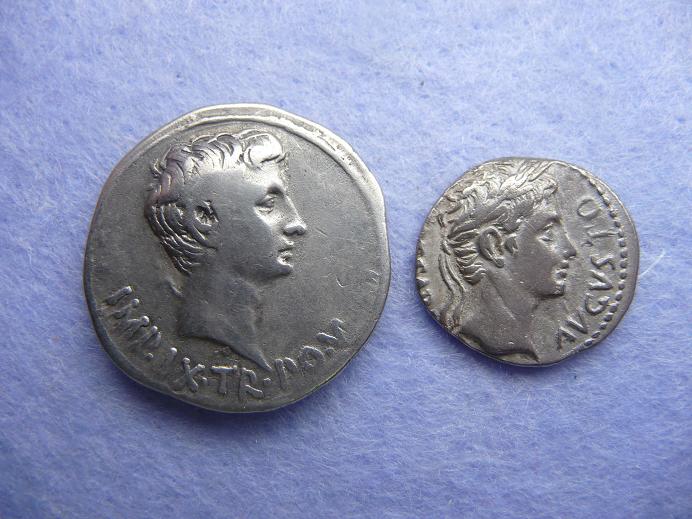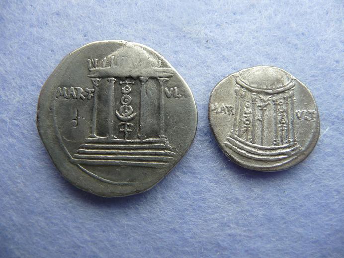 Möchte hier mal einen Vergleich zwischen Kistophor und Denar starten. Da kein RIC - zitiere ich Kampann: linke Münze: Augustus Kistophor - RV: MART VLTO - Rundtempel, darin Feldzeichen - 11,80 gr. rechte Münze: Augustus Denar - RV: MAR VLT - Rundtempel, darin Feldzeichen - 3,41 gr.