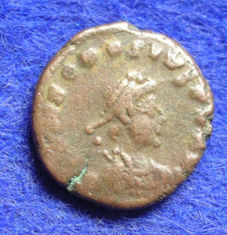 - Die Buchstaben HEODO sind auf der Vorderseite klar zu lesen, danach scheint noch ein Strichlein des S zu kommen (soweit man das bei den vergurkten Buchstabenformen sagen kann), die Kaiserzuweisung ist also klar. Interessant ist, daß vor dem H nur mehr Platz für einen Buchstaben neben der Büste ist, die Münze trägt also anscheinend nicht den Titel DN!