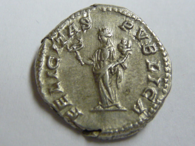 Der Typ ist auf seltenen Sesterzen und Assen von Domna längst bekannt, der Denar fehlt aber in Cohen und RIC und war im Fund von Reka Devnia auch nicht vorhanden. Wien aber besitzt ein Exemplar, das von Pink im Aufbau, Num. Zeitschrift 67, 1934, S. 10 verzeichnet wird, und das ich Seaby, Roman Silver Coins III, 1969, Nr. 251a bekanntgemacht habe, zusammen mit einem zweiten Exemplar, das ich selbst 1967 erworben hatte. 1973 erwarb das BM auch ein Exemplar, das in der 2. Ausgabe von BMC V, 1975, S. 435, Nr. 33A veröffentlicht wurde. Seither sind noch ein paar Exemplare auf dem Markt erschienen, zufälligerweise habe auch ich vor einem Monat ein zweites, besser erhaltenes Exemplar von anderen Stempeln gekauft.