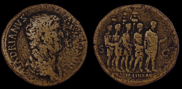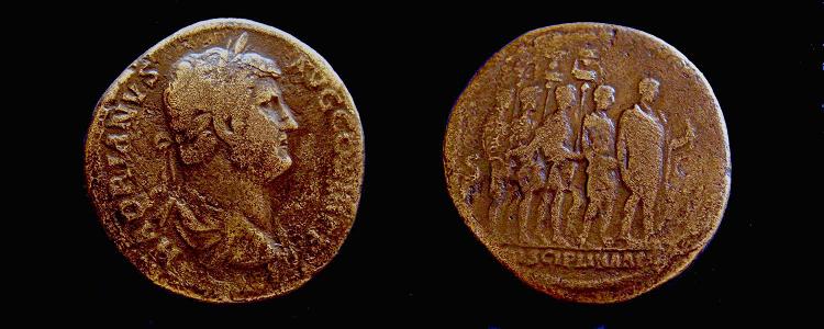 Hier ein seltener Sesterz, dessen Reversdarstellung eine Anspielung auf den militärischen Drill Hadrians ist.