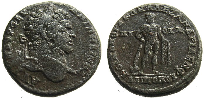 Die Münze ist geprägt auf die Pythischen oder Alexandrinischen Spiele, die 214 abgehalten wurden, als Caracalla (der "neue Alexander") die Stadt auf dem Weg zum Feldzug gegen die Parther besuchte.