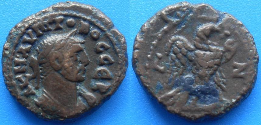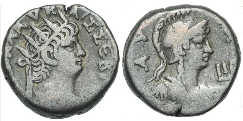 Dattari 236. Förschner 141f. Geißen 200f. Emmett 122 (sehr häufig). Kamp./Gansch. 74.110. SNG Cop. 132. RPC 5315.Im 13. Und 14. Regierungsjahr Neros finden wir ein Bündel von interessanten Rückseitentypen, die auf die Griechenlandreise des Kaisers anspielen und au seine Siege bei den verschiedenen panhellenischen Wettbewerben. So ist der ΣΕBAΣTOΦOPOΣ, der Kaiserträger, also das Schiff, das Nero nach Girechenland brachte, auf Rückseiten alexandrinischer Tetradrachmen dargestellt. Die Darstellungen von Apollon Aktios, Apollon Pythios, Hera Argeia (aus Argeios), Poseidon Isthmios, Zeus Nemeios und Zeus Olympios verweisen auf die Spiele, an denen Nero teilnahm – und die er selbstverständlich auch gewann (Kampmann.)
