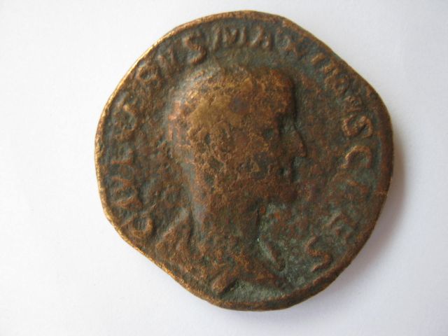 C IVL VERUS MAXIMVS CAES. Außerdem meine ich noch Reste einer Strahlenkrone zu sehen, dies kann aber auch der Korrosion geschuldet sein. Wäre aber auch bei dem Gewicht zu schwer für ein Dupondius.