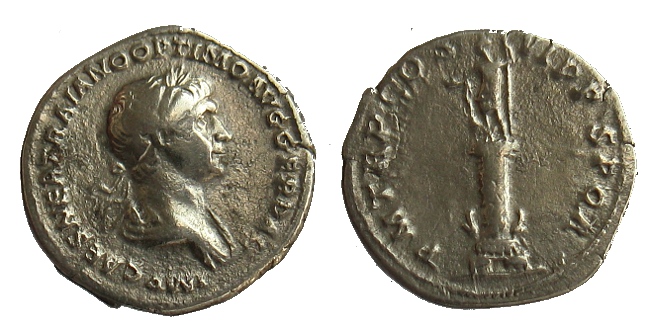 Die Trajanssäule in Rom, noch heute eines der besonderen Wahrzeichen der Stadt, wurde ca. 106 – 113 n. Chr. erbaut, um die zwei Siege gegen die Daker zu feiern, die zu Errichtung der neuen Provinz führten. Die Statue ist ca. 30 m hoch und zeigt in kontinuierlichem spiraligem Bildlauf die wichtigsten Schlachten und Ereignisse der Feldzüge. Das Münzild zeigt sowohl den Sockel mit den beiden Adlern als auch noch - trotz der Abnützung - deutliche Spuren des Bildlaufes auf der Säule. Auf der Spitze steht die mittlerweise verlorene Statue Trajans, die heute durch eine des Apostels Petrus ersetzt ist.
