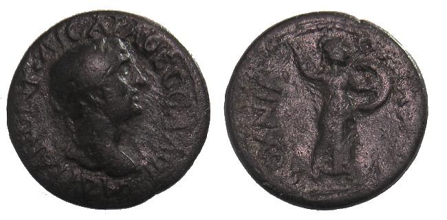 Rv.: (A)OX NIKO MAXOY, Athena Itonia nach rechts stehend, hält Schild links und schleudert den Speer rechts.