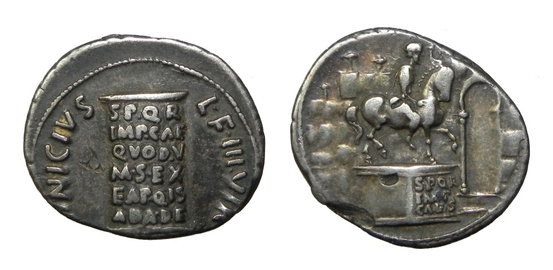 Dieser "Münzmeister-Denar" des Augustus trägt auf dem Avers den Namen des Münzmeisters: L VINICIVS L F III VIR sowie eine Säule mit der Inschrift: S P Q R / IMP CAE / QVOD V / M S EX / EA P QIS / AD A DE