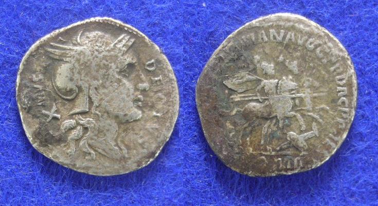 Wie Ihr ja wißt, bin ich bei seltenen Münzen durchaus bereit, Kompromisse bei der Erhaltung zu machen; so ist auch diese Münze bei mir gelandet. Sie hat wirklich fast alle Fehler, die eine Münze so haben kann - sie ist abgeplattet (ich vermute eine fette Prägeschwäche, ein nachträglicher Hammerschlag erscheint mir weniger wahrscheinlich), ist abgegriffen, korrodiert mit Hornsilber, verkratzt, der Schrötling blättert ab - nein, alle Fehler hat sie nicht: Sie ist echt und nicht bearbeitet, und sie hat immer noch einen schönen Romakopf. Und vor allem ist sie richtig selten - alle Restitutionsdenare des Trajan sind verteufelt selten, zwei oder drei Typen etwas häufiger als die anderen. Bei diesem Typ kommt noch hinzu, daß er kein republikanisches Vorbild hat - die gens Decia war zur Zeit der Magistratsnamen auf römischen Münzen bereits ausgestorben. Mit dieser Prägung Trajans wurde der Kriegsheld Publius Decius Mus geehrt - die Erzählungen sind hier etwas verworren, angeblich sollen sich drei Decii dieses Namens, Großvater, Vater und Sohn, in der Schlacht den Göttern geopfert haben.