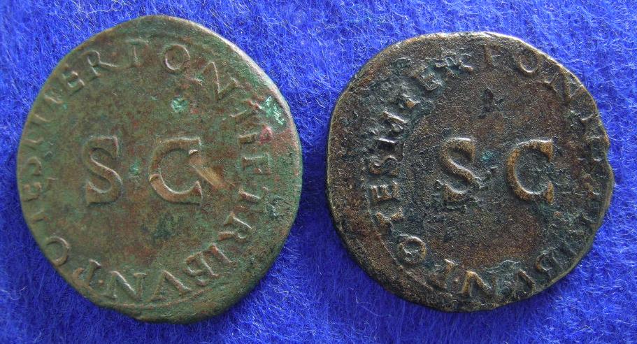 Dargestellt ist Drusus junior, Sohn und designierter Nachfolger des Tiberius, der 23 nach Chr. einer Intrige des Sejanus zum Opfer fallen sollte. 22-23 wurde eine Emission Asse (RIC Tib. 45) ausgegeben, die den Thronerben vorstellte. Sowohl diese Asse als auch die Restitutionsmünzen dieses Typs unter Titus sind in der Literatur ausschließlich mit Linksporträt verzeichnet. Nachdem ich vor einem Jahr eine solche Münze mit Rechtsporträt erwerben konnte, die CNG beim Katalogisieren durch die Lappen gegangen war (verkauft als RIC 45), war ich doch relativ baff, als jetzt ein Exemplar auf Ebay Deutschland auftauchte. Beiliegend Fotos vom Wiedersehen der Münzen nach 1988 Jahren Trennung. Rechts das CNG-Exemplar, links die Ebay-Münze.