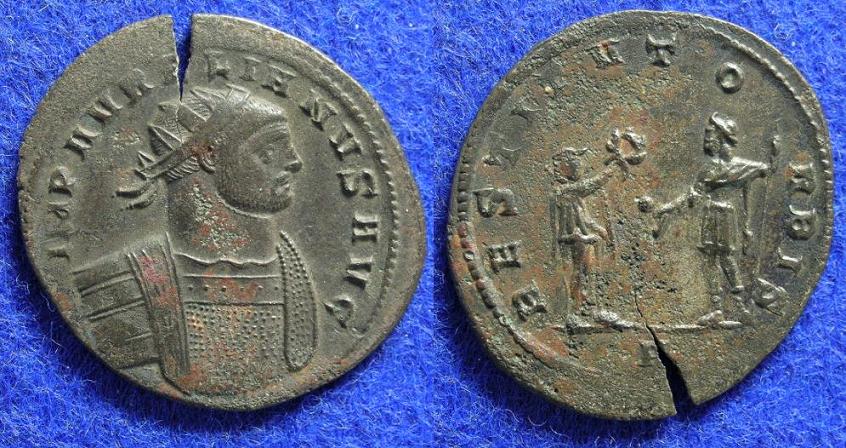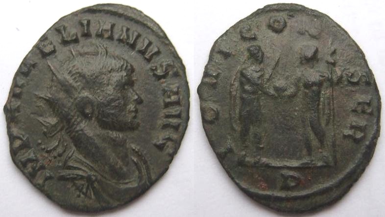 Den selben Typ wie tauriskers Münze gibt es mit gleicher Legende auch noch noch aus Mediolanum (RIC 135), da hilft nur der Stil weiter. Nach umfangreichen Vergleichen bin ich der Meinung, mein plattnasiger und langhalsiger Aurelian kommt aus dieser Münzstätte.