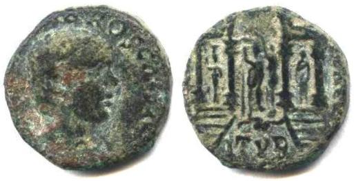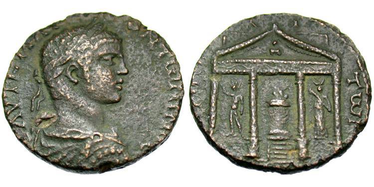 Anm.: Der antike Name von Caesarea war Arka. Wahrscheinlich unter Elagabal wurde sie in den Rang einer römischen Kolonie erhoben und erhielt den Namen Colonia Caesarea Libani. Dies war der Geburtsort des Severus Alexanders, des Cousins, Adoptivsohns und Nachfolgers des Elagabal. In Caesarea bestand ein wichtiger Astartekult. Ob diese interessante dreiflüglige Tempelform tatsächlich der Realität entspricht, wissen wir nicht. Eine Beschreibung dieses Tempels findet sich in den Saturnalia des Macrobius. Die beiden Figuren in den Seitenflügeln können nicht eindeutig identifiziert werden. Aufgrund ihrer Ikonographie scheint es sich um die 'Herrin der Tiere', Potnia theron, zu handeln, während die re Figur vielleicht Aphrodite ist. ITVR im Abschnitt verweist auf das Volk der Ituräer, das in diese Region als Nomaden lebte.