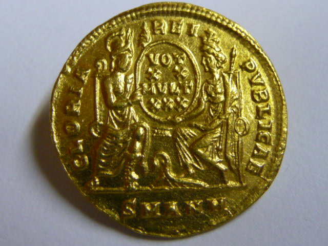 Rv. hält der Kaiser hier ausnahmsweise keinen Phoenix auf Globus, sondern eine „Victoriola“, also eine kleine Victoriastatuette, welche Constantius quasi symbolisch einen Siegerkranz reicht. Auch im Heck der Galeere sitzt nicht Fortuna, wie an ihren Flügeln unschwer zu erkennen ist, sondern ebenfalls eine Victoria am Steuerruder.