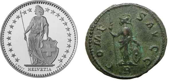 ( Die Rückseitendarstellung erinnert mich ein wenig an "unsere" Helvetia. ( die Minerva müsste nur noch den Helm ausziehen