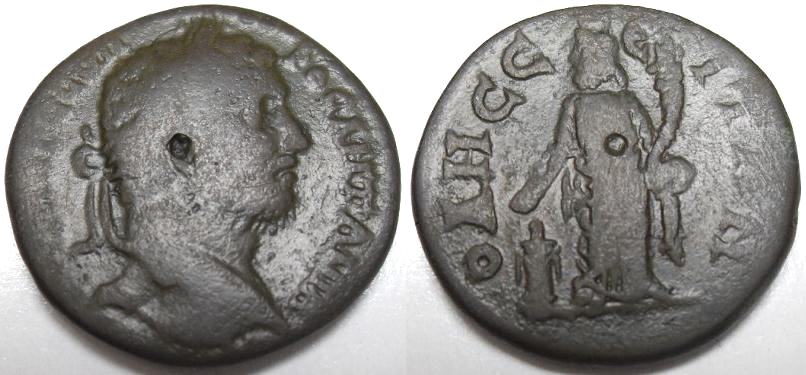 Rs: [FLAOUIOPOLîI-TWN îTOUC - xD], Tyche im langen Gewand frontal stehend, Kopf nach links, in der Linken Füllhorn haltend, in der Rechten Patera.