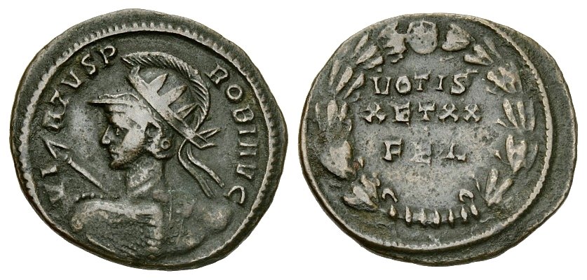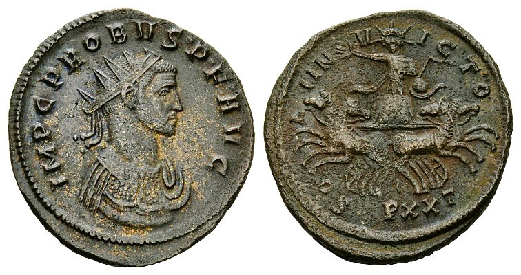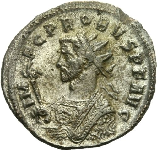 VIRTVS PROBI AVG laureate, helmeted and cuirassed bust left, holding Victory in right hand, shield on left arm, spear over shoulder
