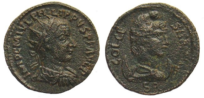 Av.: IMP C M IVL PHILIPPVS P F AVG P: drapierte, kürassierte und bärtige Büste des Kaisers mit Strahlenkrone n. re.