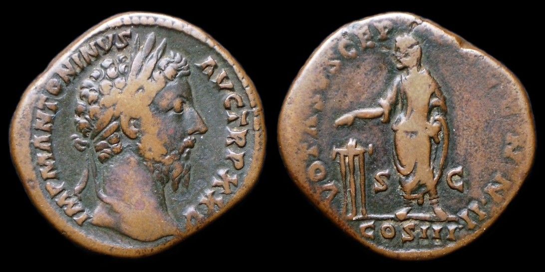 Marcus Aurelius AE Sestertius. IMP M ANTONINVS AVG TR P XXV, laureate head right / VOTA SUSCEP DECENN II S-C, Marcus Aurelius sacrificing over tripod altar left, COS III in ex.