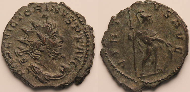 IMP C VICTORINVS P F AVG, radiate and cuirassed bust right /