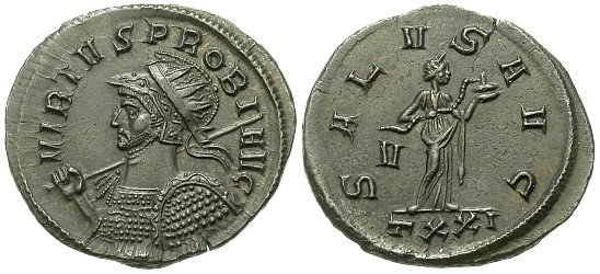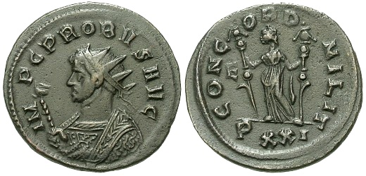 Eine Dekade vor den codierten Münzen des Diocletian und des Maximian aus Siscia gab es bereits unter Probus codierte Münzen aus Rom und Ticinum. Diese Codierung ist erheblich komplizierter als das System aus Siscia. Dazu hat Chip Scoppa einen grundlegenden Artikel geschrieben. Dieser Artikel ist so umfassend, daß ich dazu nichts weiter schreiben werde, sondern ihn allen Interessierten wärmstens ans Herz lege:. http://www.forumancientcoins.com/numisw ... ey=AEQVITI