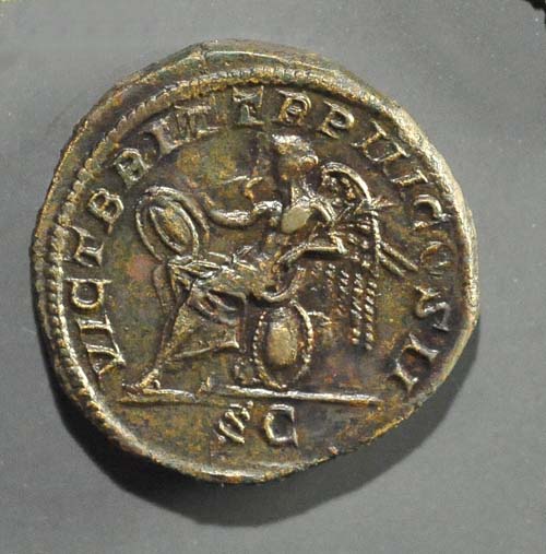 Vom Raeticus im deutschen Forum habe ich vor ein paar Monaten einen Dupondius des Geta vom selben Vs.Stempel bekommen, mit Rs. VICT BRIT TR P III COS II S C. Hier das schöne Bild davon, bevor etliche Reparaturen entdeckt und entfernt wurden!
