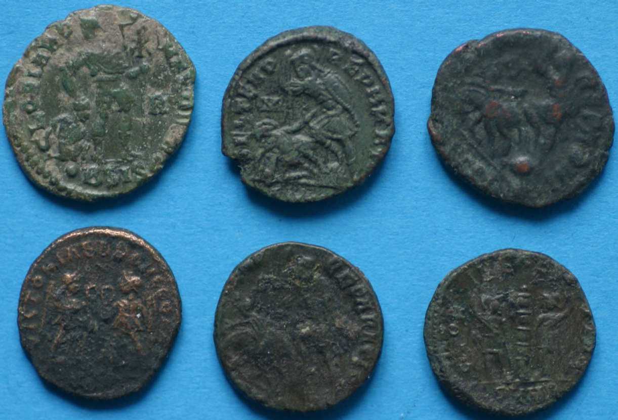 deine Spätrömer scheinen garnicht so schlecht erhalten zu sein, zumindest besitzen sie noch so etwas, wie eine intakte Patina. Bestimmbar scheinen sie mir auch. Allerdings benötigt man dazu auch Gewicht, Durchmesser und vor allem das Münzstättenzeichen im Abschnitt, was für mich hier zum Teil nicht erkennbar war. Im folgenden, was ich erkennen konnte (von links nach rechts):
