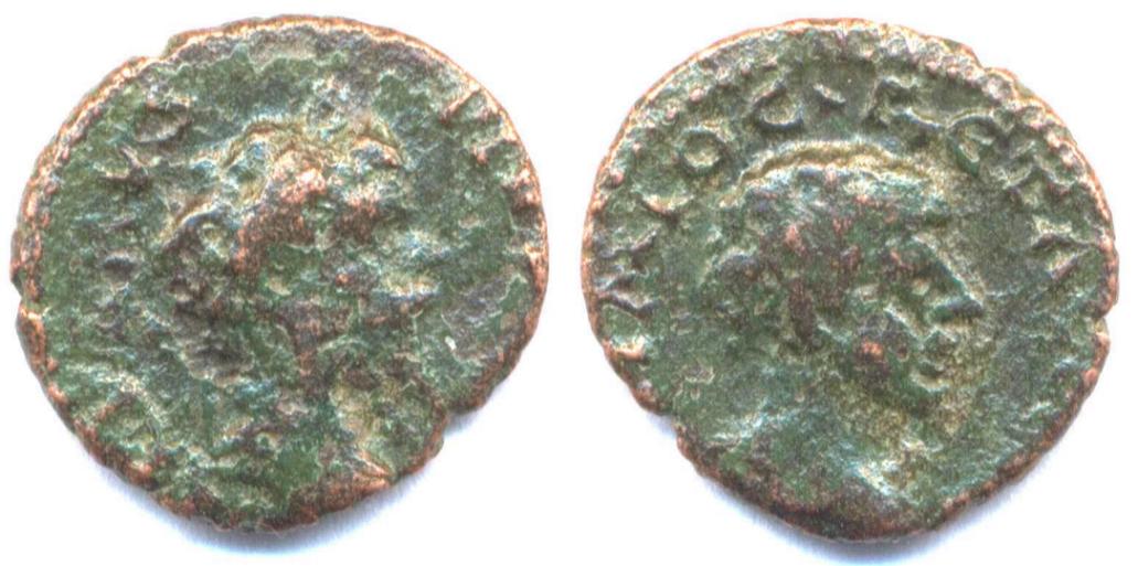Diese Münze ist mir ein großes Rätsel, weil in den Legenden nur die Namen der Dargestellten auftauchen, nicht aber die Ethnik, die ausgebende Münzstätte. Dem Stil nach stammt diese Münze sicherlich aus Nordgriechenland, also Moesien oder Thrakien. Nikopolis selbst ist natürlich völlig unsicher. Aber von dort gibt es Kleinmünzen von Severus und Domna auf der Rs. mit merkwürdigen Abkürzungen wie z.B. IO DO. Andererseits erinnert der Struwelkopf des Geta stark an andere Münzen aus Markianopolis.