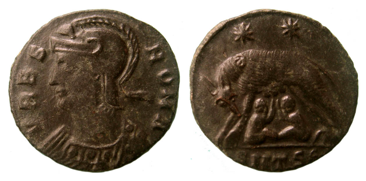 Rv. Keine Umschrift / Wölfin n. l. stehend, Zwillinge säugend, darüber zwei Sterne. Im Abschnitt SMTSЄ. Marke „“ auf der Schulter der Wölfin.
