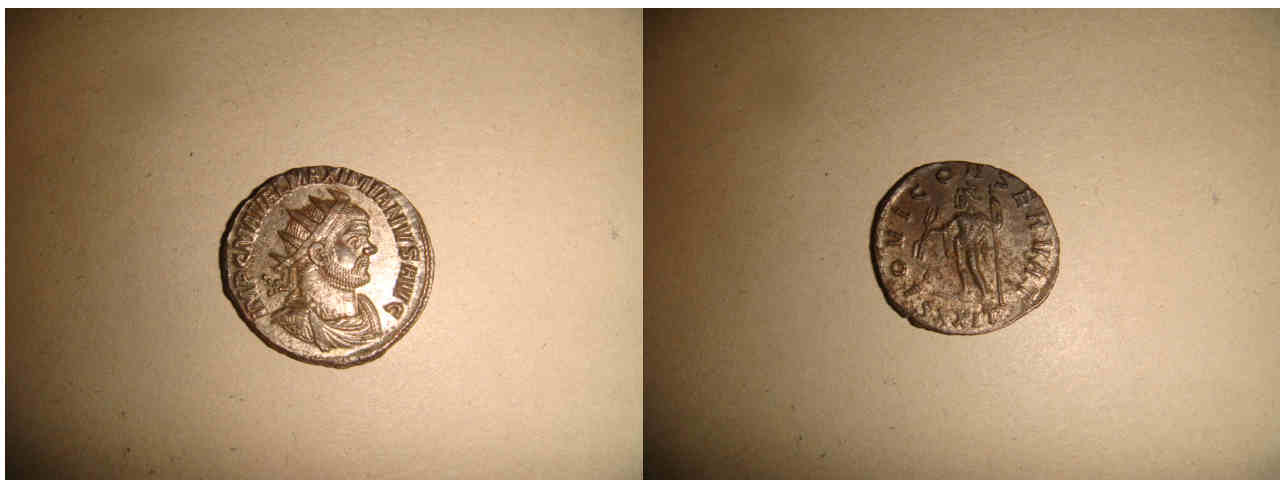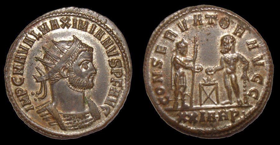1) Av.: Büste des M. mit Strahlenkrone, IMP.C.M.A.VAL.MAXIMIANUS AUG., Rv.: Jupiter mit Blitzbündel, IOVI CONSERVAT., im Abscnitt: SXXIT