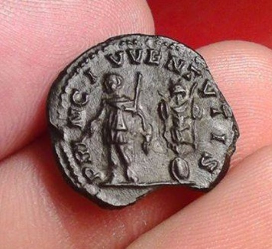 Es handelt sich vermutlich um einen AE-, Bronze- oder Gussdenar, fälscherlicherweise oft auch "Limesdenar" genannt. Gussdenare waren insbesondere in der Severerzeit eine Art von "Notgeld" um einen Mangel an silbernen Umlaufmünzen zu beheben. Sie wurden nicht geprägt, sondern irregulär in Tonförmchen gegossen, aber wohl von offizieller Seite toleriert. RIC nennt als Seltenheitsgrad "common" also "häufig). Angesichts des Ausbruchs am Rand, jedoch des hervorragenden Gusses würde ich den Wert bei etwa 15 - 20 EUR ansetzen. Geta, AE denarius, ca. 200-202 AD. Av. P SEPT GETA CAES PONT, bare-headed, draped bust right. Rv. PRINC IVVENTVTIS, Geta, in military dress, standing left, holding with baton and sceptre, trophy behind. Ref. RIC 18, RSC 157, Sear 5/7196. http://www.wildwinds.com/coins/ric/geta ... _Limes.jpg |