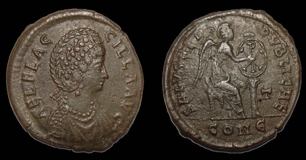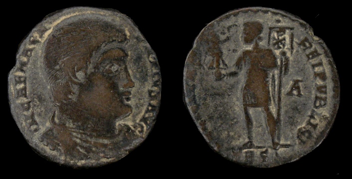 heute möchte ich mal einen neuen Thread mit einer etwas ungewöhnlichen Thematik beginnen, in der Hoffnung auf rege Beteiligung eurerseits, nämlich "spätrömische Münzen mit christlicher Symbolik". Als erstes möchte ich Euch einen Procopius vorstellen, den ich vor etwa einem Jahr in einem kleinen Lot von unbestimmten Spätrömern (nicht ungereinigt!) fand.