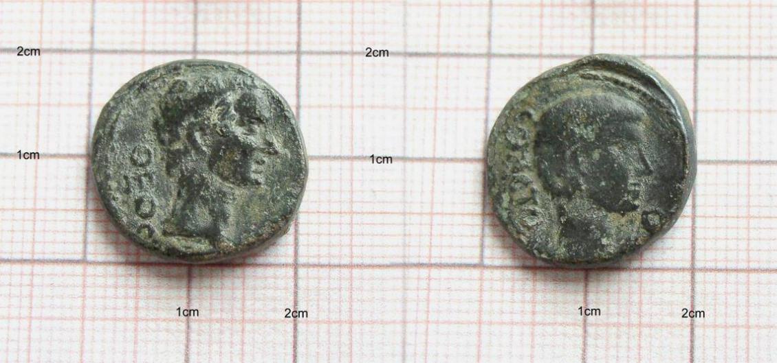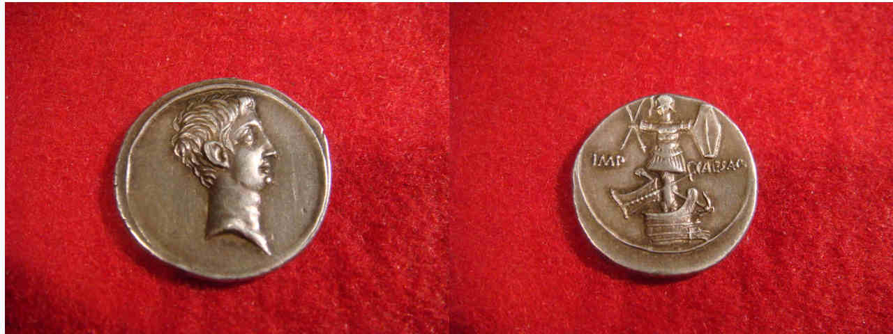 Der linke Denar: RIC I /Seite 48 Nummer; 108a R2 als Seltenheitsangabe; geprägt: ca. 18 v.Chr. / Prägestätte: Spanien