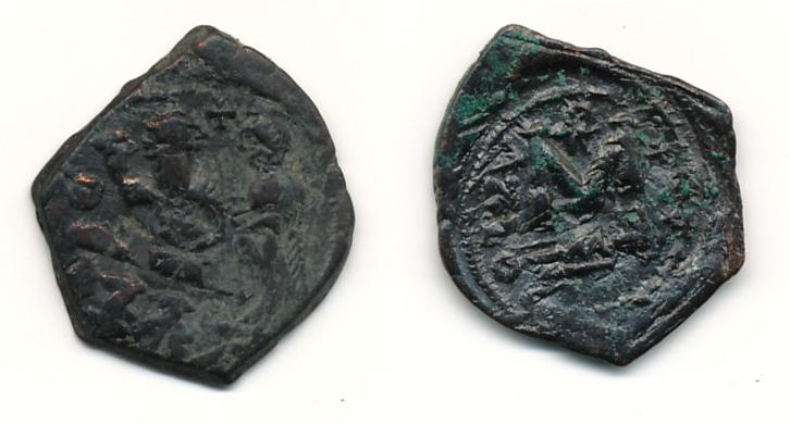 Die Gastmünze ist ein Follis MIB 164 aus Constantinopel (mit Kreuzglobus) geprägt 629/630. Dieser Follis wurde 639/640 überprägt mit MIB 166/167. Offensichtlich erfolgte die Überprägung ohne Zwischenglühen, d.h. auf der prägeharten Gastmünze, weil das neue Relief kaum durchgezeichnet ist.