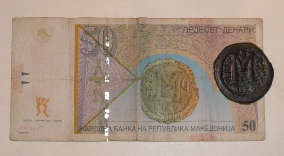 Nein, Münzen habe ich von meinem Urlaub in Mazedonien nicht mitgebracht, aber eine 50-Denar-Banknote. Sie zeigt zu meiner Überraschung eine Münze, die sich auch in meiner Sammlung findet, nämlich einen Follis Kaiser Justinians I., geprägt in Nikomedia. Justinian, in Tauresium nahe Skopje geboren, war einer der bedeutendsten Herrscher der Spätantike. Es gelang ihm große Teile des ehemaligen Römischen Imperiums dem Byzantinischen Reich wieder einzuverleiben. Er ließ die Festung Kale in Skopje erbauen.