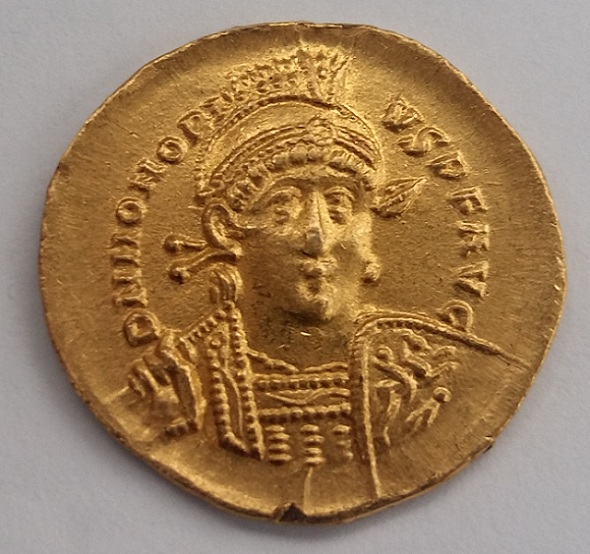 Die Vorderseite scheint dagegen von einem Solidus des Honorius zu stammen, der deutlich früher etwa im Zeitraum von 397 – 402 AD geprägt wurde. DN HONORI – VS PF AVG / Behelmte, gepanzerte Büste mit Diadem, Zepter und reiterverziertem Schild. RIC X, 8.