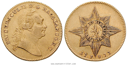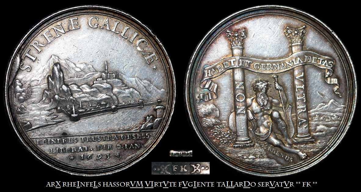Rs. Zwei korinthische Säulen mit der Aufschrift NON ULTRA, am Sockel der linken Säule PHM, zwischen den Säulen der sitzende Flussgott Rhenus mit einer sprudelnden Quellurne. Über dem Flussgott ein Spruchband mit der Inschrift HABET ET GERMANIA METAS, erhabene Randinschrift ARX RHEINFELS HASSORVM VIRTVTE FVGIENTE TALLARDO SERVATVR ** FK ** („Die Festung Rheinfels durch den Mut der Hessen und die Flucht Tallards gehalten.“ Die großen Lettern – s. Abb - stellen ein Chronogramm dar – 1693.)