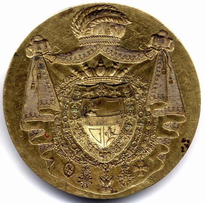 Das ist bei näherer Betrachtung nicht richtig, denn die unter dem Schild abgebildeten Kronen gehören zu den Orden die darunter hängen. Auf dem Bleiabschlag wird also nur der Grafentitel verwendet, während auf dem Messingsiegel zusätzlich der Fürstentitel auftaucht.