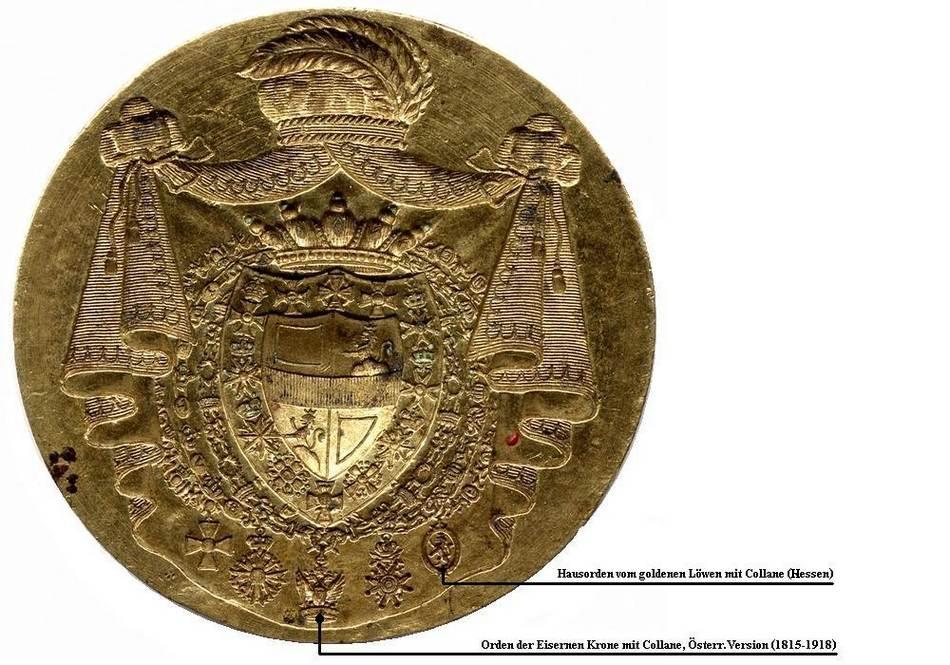 Das Gesamtbild des Wappens erscheint mir zu überladen, um einer Adelsfamilie mit Tradition zuzuweisen zu sein: zwei Kronen, fünf Orden mit Colanen, ein mit Ordenssternen belegter Wappenrand. Die Herkunft der beiden identifizierten Orden liegt zwar räumlich weit auseinander, das will aber nichts heißen - sie können einem Geschäftsmann oder Diplomaten verliehen oder von ihm erworben worden sein. Der österreichische Orden war zeitweilig käuflich, der hessische Orden war ebenfalls zeitweilig auf keinen festen Personenkreis beschränkt.