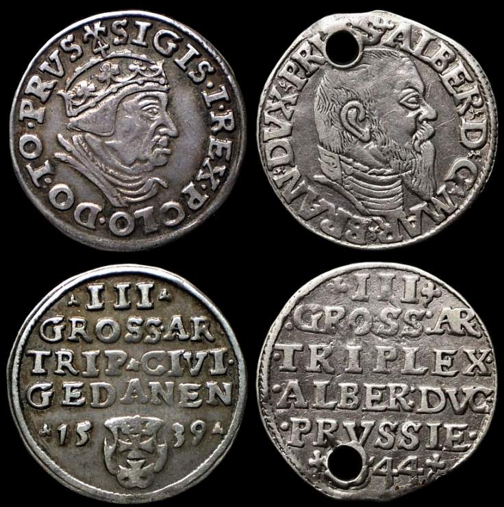 Damit dieser Beitrag aber nicht ganz in der Gegenwart stehen bleibt, stelle ich den in der Anm. genannten Lehnsherrn Sigismund I., König von Polen und seinen Neffen und Lehnsmann Albrecht, Herzog von Brandenburg hier im zeitgenössischen Münzbild in verschiedenen Lebensaltern vor.