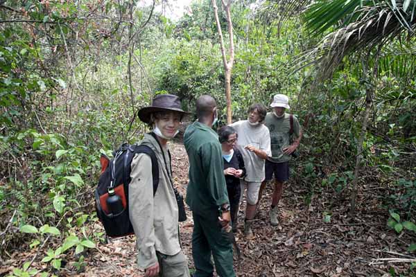 Auf dem Weg zu den Hütten erzählte uns der Ranger das wir großen Glück hätten da eine Schimpansenfamilie nur eine Stunde Marsch von hier gesichtet wurde. Er empfahl unverzüglich aufzubrechen. Also kurz das Gepäck verstauen, festes Schuhwerk anlegen und los ging es. Bereits nach 20 Minuten in einer mit Wasser gesättigten Luft war ich durch und durch Nass geschwitzt. Wenn das so weiter ging würden unsere Wasservorräte nicht lange reichen.