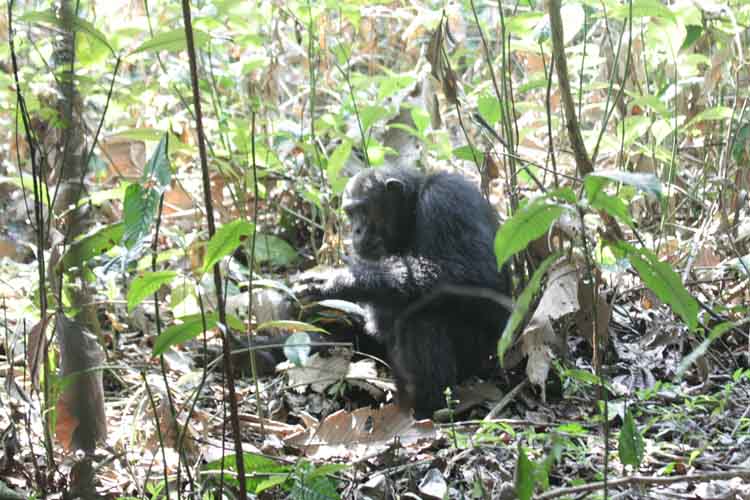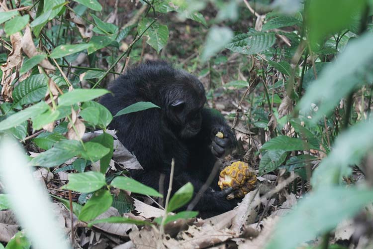 Nun wurde es spannend! Zielsicher führte uns unser Guide quer durch den Urwald auf die Affenfamilie hin, plötzlich und unerwartet standen wir wenige Meter vor zwei Schimpansen die auf dem Boden saßen und sich eine mir unbekannte Baumfrucht zu Gemüte führten. Der Ranger bedeutet uns nun unseren bei Beginn der Tour ausgegeben Mundschutz aufzusetzen. Dieser soll verhindern das die Menschenaffen durch eingeschleppte Krankheiten infiziert werden. Nun folgten wir den Tieren ca. 1 Stunde quer durch den Wald, der Ranger machte dabei ausgiebigen gebrauch von seiner Machete, denn im Gegensatz zu den Affen brauchten wir eine Durchgangshöhe von ca. 1,60-1,80 Metern.