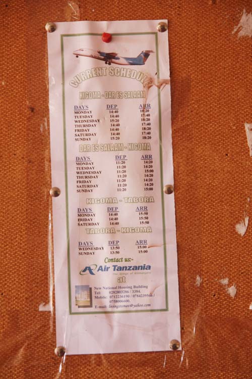 Zu Deiner Anmerkung zum Flufplatz Kigoma. Das Personal war durchaus bemüht eine Abfertigung nach westlichem Standard zu bewerkstelligen. D.h es fand auch eine ausführliche Gepäckkontrolle statt, merkwürdig aber war das jeder rechts und links an dieser Kontrollbaracke vorbei aufs Flugfeld gehen konnte!