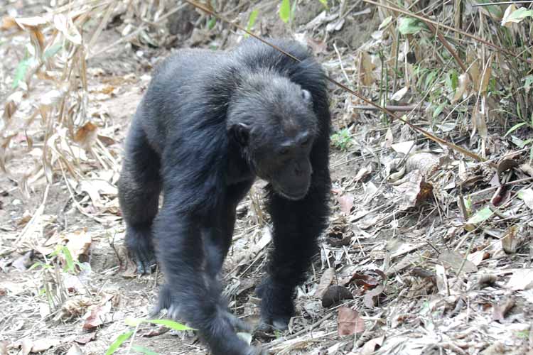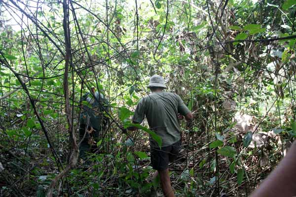 Auf dem Weg zu den Hütten erzählte uns der Ranger das wir großen Glück hätten da eine Schimpansenfamilie nur eine Stunde Marsch von hier gesichtet wurde. Er empfahl unverzüglich aufzubrechen. Also kurz das Gepäck verstauen, festes Schuhwerk anlegen und los ging es. Bereits nach 20 Minuten in einer mit Wasser gesättigten Luft war ich durch und durch Nass geschwitzt. Wenn das so weiter ging würden unsere Wasservorräte nicht lange reichen.